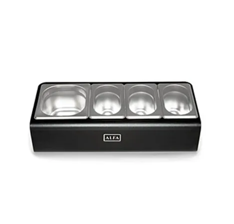 Conçu en acier au carbone peint de 2 mm, il accueille 4 bacs professionnels : trois au format GN 1/9 et un au format GN 1/6, parfaits pour stocker et organiser vos garnitures.